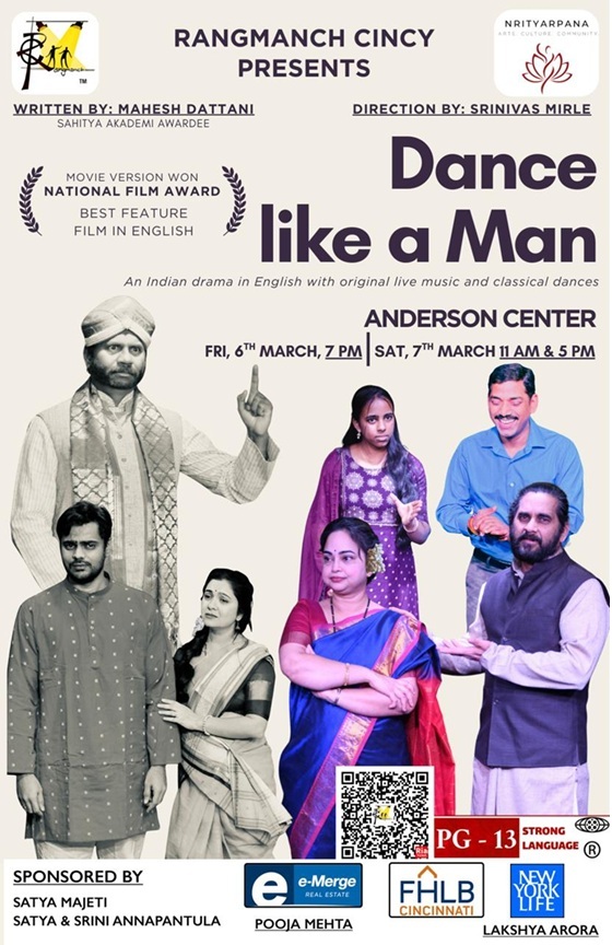Rangmanch Cincy and NSPA (Nrityarpana School of Performing Arts) present “Dance Like A Man”, a celebrated drama in English by Mahesh Dattani, Sahitya Akademi Awardee, India’s highest award for literature (https://sahitya-akademi.gov.in/). The production includes a diverse group of actors and classical dancers presenting new musical compositions by esteemed virtuosos led by Vidwans G. Gurumurthy. Performances will be conducted on Mar 6-7, 2026 in the Anderson Center Theater.